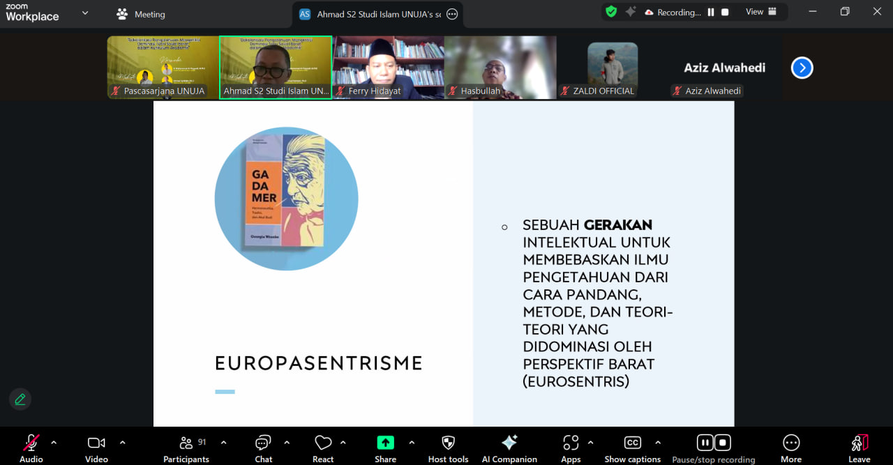 Kegiatan yang diikuti oleh 89 peserta dari kalangan mahasiswa, dosen, dan praktisi pendidikan ini menjadi ruang intelektual untuk merenungkan kembali arah keilmuan bangsa. Diskusi dipandu oleh Dr. Abu Khaer, MA., Hum., dosen Pascasarjana UNUJA, dengan menghadirkan tiga narasumber yang berkompeten di bidang filsafat, ilmu sosial, dan kajian Islam kontemporer.
